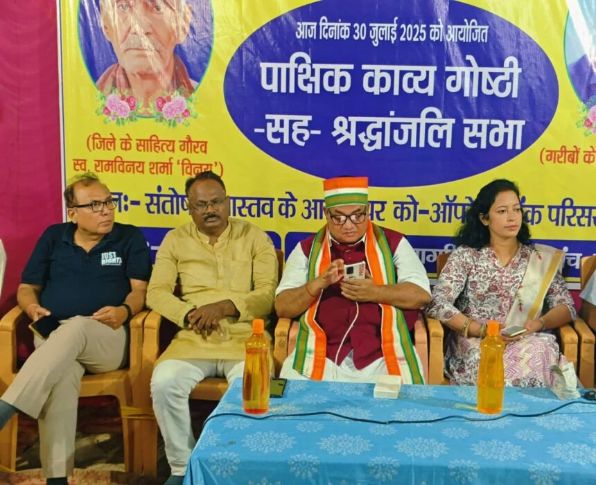 अरवल – पाक्षिक काव्य गोष्ठी के दुसरे बर्ष – गांठ पर नागरिक विकास मंच के द्वारा आयोजित कार्यक्रम में साहित्य गौरव स्व राम विनय शर्मा ‘विनय’ तथा गरीबो के मसीहा स्व डा के राजन को कवि तथा साहित्यकारों ने श्रद्धाजलि देते हुए उनके कार्यों पर चर्चा के साथ काव्य पाठ किया गया। 30 जुलाई को संतोष श्रीवास्तव के आवास पर आयोजित कार्यक्रम कि अध्यक्षता नागरिक विकास मंच के जिलाध्यक्ष शिक्षाविद डा एस के सुनील ने किया। कार्यक्रम का संचालन मंच के सचिव एवम वरीय पत्रकार संतोष श्रीवास्तव ने किया।