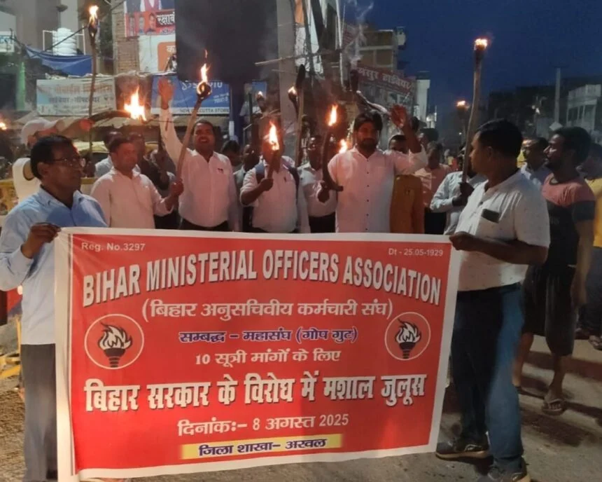 अरवल -बिहार राज्य अनुसचिवीय कर्मचारी संघ गोप गुट के प्रदेश स्तरीय आह्वान पर अरवल जिले में भी मशाल जुलूस निकाला गया। मशाल जुलूस महासंघ भवन अरवल से शुरु होकर भगत सिंह चौक तक गया।मार्च का नेतृत्व बिहार राज्य अनुसचिवीय कर्मचारी संघ गोप गुट के जिलाध्यक्ष सत्य प्रकाश भारती ने किया। दीगर हो कि बिहार राज्य अनुसचिवीय कर्मचारी संघ के दस सूत्री मांगों के समर्थन में लगातार आंदोलन जारी है।इसी क्रम में पूरे प्रदेश के सभी जिला मुख्यालय पर मशाल जुलूस निकाला जाना है।