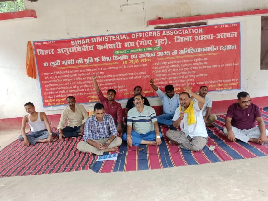 अरवल – बिहार अनुसचिवीय कर्मचारी संघ (गोप गुट) का अनिश्चितकालीन हड़ताल बुधवार को उन्नीसवें दिन भी जोश और तेवर के साथ जारी रहा। जिसकी अध्यक्षता जिला अध्यक्ष सत्य प्रकाश भारती ने किया। अपने संबोधन में वक्ताओं ने कहा कि धरना स्थल पर कर्मियों की गूंज और नारेबाज़ी ने साफ कर दिया कि अब यह आंदोलन आर-पार की लड़ाई में तब्दील हो चुका है।