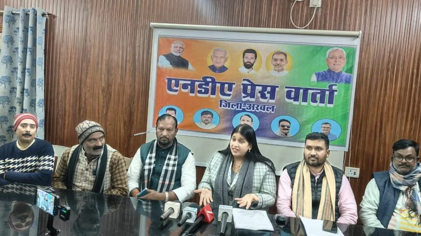 अरवल – भारत की एनडीए सरकार ने विकसित भारत गारंटी फॉर रोजगार आजीविका मिशन बिल पास किया है। इसी मुद्दे पर एनडीए के सभी दलों के जिला अध्यक्षों के संयुक्त नेतृत्व में अरवल जिला अतिथि गृह में प्रेस कॉन्फ्रेंस आयोजित की गई । जिसमें मुख्य वक्ता बिहार विधान परिषद सदस्य अनामिका सिंह ने प्रेस को संबोधित किया। इसमें भाजपा जिलाध्यक्ष धर्मेन्द्र तिवारी, हम जिलाध्यक्ष सुनील शर्मा, लोजपा जिलाध्यक्ष सत्येन्द्र रंजन, रालोमो जिलाध्यक्ष रविन्द्र राम, जेडीयू प्रवक्ता चांद मलिक मौजूद रहे।