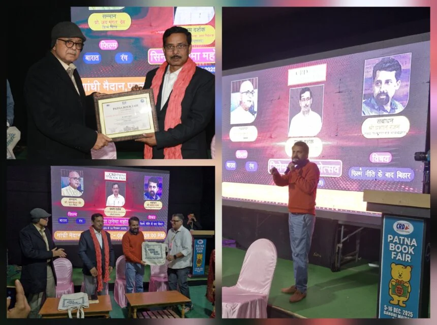 इससे पूर्व कार्यक्रम के आरंभ में जाने-माने फिल्म विश्लेषक प्रो. जय देव को पटना पुस्तक मेले के संयोजक अमित झा द्वारा प्रतीक चिन्ह, प्रमाणपत्र एवं स्टॉल देकर सम्मानित किया गया। कार्यक्रम का संयोजन रविकांत द्वारा किया गया।