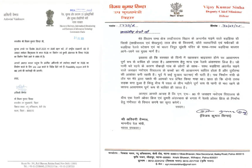 लखीसराय — बरसात के मौसम में बाढ़ और जलजमाव के कारण लखीसराय जिले के बड़हिया क्षेत्र के ग्रामीणों, किसानों, विद्यार्थियों और पर्यटकों को लंबे समय से आवागमन में भारी कठिनाइयों का सामना करना पड़ रहा है। बड़हिया रेलवे स्टेशन और मां त्रिपुर सुंदरी मंदिर से होकर गुजरने वाला मार्ग, विशेष रूप से बड़हिया बाजार और जवाहर नवोदय विद्यालय तक जाने का प्रमुख रास्ता है, जो वर्षा ऋतु में पूरी तरह बाधित हो जाता है। इससे निजात दिलाने के लिए बिहार सरकार में उप मुख्यमंत्री विजय कुमार सिन्हा ने केंद्रीय रेल मंत्री अश्विनी वैष्णव को खत लिखा था। अब रेल मंत्री के तरफ से इसको लेकर के संबंधित अधिकारियों को साइट विजिट करने का निर्देश दिया गया है।