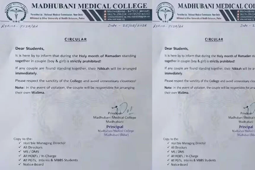 मधुबनी (बिहार) : सोशल मीडिया पर इन दिनों मधुबनी मेडिकल कॉलेज का एक कथित लेटर सोशल मीडिया एक्स पर तेजी से वायरल हो रहा है, जिसने न केवल छात्रों बल्कि आम जनता के बीच भी खलबली मचा दी है। इस वायरल लेटर के अनुसार रमजान के पवित्र महीने के दौरान यदि कोई छात्र और छात्रा (कपल) परिसर में एक साथ खड़े पाए जाते हैं, तो कॉलेज प्रशासन उनका निकाह करा देगा। हालांकि, कॉलेज प्रशासन ने इस पत्र को पूरी तरह फर्जी करार देते हुए इसे खारिज कर दिया है।