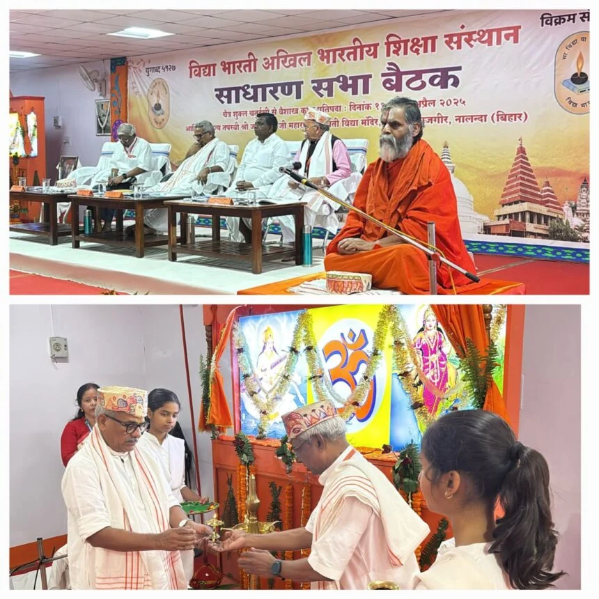 राजगीर : विद्या भारती अखिल भारतीय शिक्षा संस्थान के तीन दिवसीय साधारण सभा बैठक राजगीर स्थित पूज्य तपस्वी जगजीवन जी महाराज सरस्वती विद्या मंदिर में शुक्रवार को शुरू हो गई, जो 13 अप्रैल तक चलेगी। बैठक का उद्घाटन मुख्य अतिथि संत लक्ष्मीप्रपन्न जीयर स्वामी जी महाराज एवं राष्ट्रीय स्वयंसेवक संघ के सह सरकार्यवाह डॉ. कृष्ण गोपाल जी ने संयुक्त रूप से मां शारदे के समक्ष दीप प्रज्वलन एवं पुष्पार्चन कर किया। अध्यक्षता विद्या भारती के राष्ट्रीय अध्यक्ष डी. रामकृष्ण राव ने की। वहीं संचालन क्षेत्रीय मंत्री राम अवतार नरसरिया ने किया। राष्ट्रीय महामंत्री अवनीश भटनागर ने वार्षिक प्रतिवेदन प्रस्तुत किया। कार्यक्रम की प्रस्तावना विद्या भारती के राष्ट्रीय संगठन मंत्री गोविंद चंद्र महंत ने रखी।