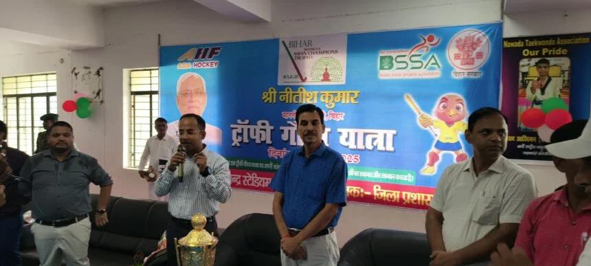 नवादा : संयुक्त सचिव, खेल विभाग, बिहार, पटना तथा बिहार राज्य खेल प्राधिकरण, पटना के निदेशानुसार मेन्स हॉकी हीरो एशिया कप-2025 का आयोजन दिनांक 29 अगस्त से 07 सितम्बर 2025 तक राज्य खेल अकादमी, राजगीर (नालंदा) में किया जा रहा है। राज्य में खेल संस्कृति को मजबूत करने तथा युवाओं को खेल के प्रति आकर्षित करने के उद्देश्य से सभी जिलों में ’’ट्रॉफी गौरव यात्रा’’ निकाली जा रही है।