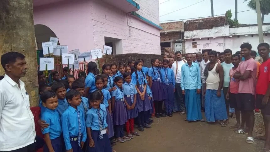 नवादा : जिलातंर्गत नारदीगंज प्रखंड के उत्क्रमित मध्य विद्यालय हरनारायणपुर में स्थानीय शिक्षकों के व्यवहार से नाराज स्कूली बच्चों व अभिभावकों ने विरोध में शनिवार को विद्यालय के दरवाजे पर ताला जड़ दिया। स्कूली बच्चों ने वर्ग कक्ष में पढ़ाई करने के बजाय हाथों में तख्ती लेकर नारा लगाते हुए विरोध जताया। इस बीच उनके अभिभावक वहां मौजूद रहे। बच्चों ने तख्तियों में लिखा- ‘तालाबंदी का शौक नहीं, यह हम सब की मजबूरी है। हम सब बच्चों का नारा है, शिक्षा अधिकार हमारा है।’