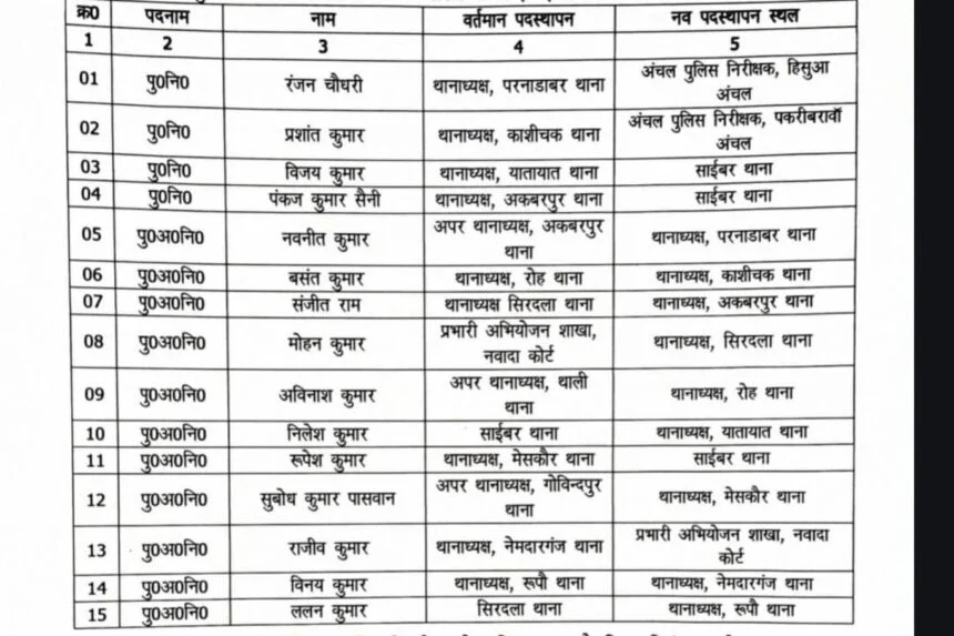 नवादा : पुलिस कप्तान अभिनव धीमान ने पटना के एसएसपी की तर्ज पर एक साथ व्यापक पैमाने पर कई थानेदारों को इधर से उधर कर दिया। ऐसा उन्होंने अपराध पर नियंत्रण करने के उद्देश्य से किया है। लेकिन ऐसा हो सकेगा इसमें संदेह है।स्थानांतरित किये गये कई गालीबाज हैं तो कई पर न्यायालय ने कर्तव्यहीनता का आरोप लगा जुर्माना लगा रखा है, बावजूद उन्हें थाने की कमान थमाई है।