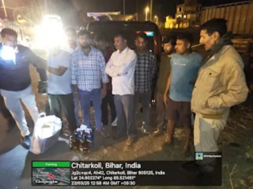 उत्पाद अधीक्षक अरुण कुमार मिश्र ने बताया कि बिहार मद्यनिषेध को लेकर समेकित जांच चौकी पर उत्पाद एसआई राजेश कुमार पटेल के नेतृत्व में उत्पाद बलों के सहयोग से झारखंड की ओर से आनेवाली प्रत्येक वाहनों की सघन जांच की जाती है। जांच के क्रम में उत्पाद एसआई प्रवीण कुमार ने एक काले रंग की स्कॉर्पियो संख्या-बीआर-01एचई/7667 से पांच बोतल विदेशी शराब बरामद किया। जब्त शराब में इंपीरियल ब्लू 750 एमएल का दो बोतल, रॉयल चैलेंज 750 एमएल का दो बोतल एवं रॉयल स्टैग 375 एमएल का एक बोतल शामिल है।स्कॉर्पियो में सवार कुल आठ लोगों को गिरफ्तार किया गया।