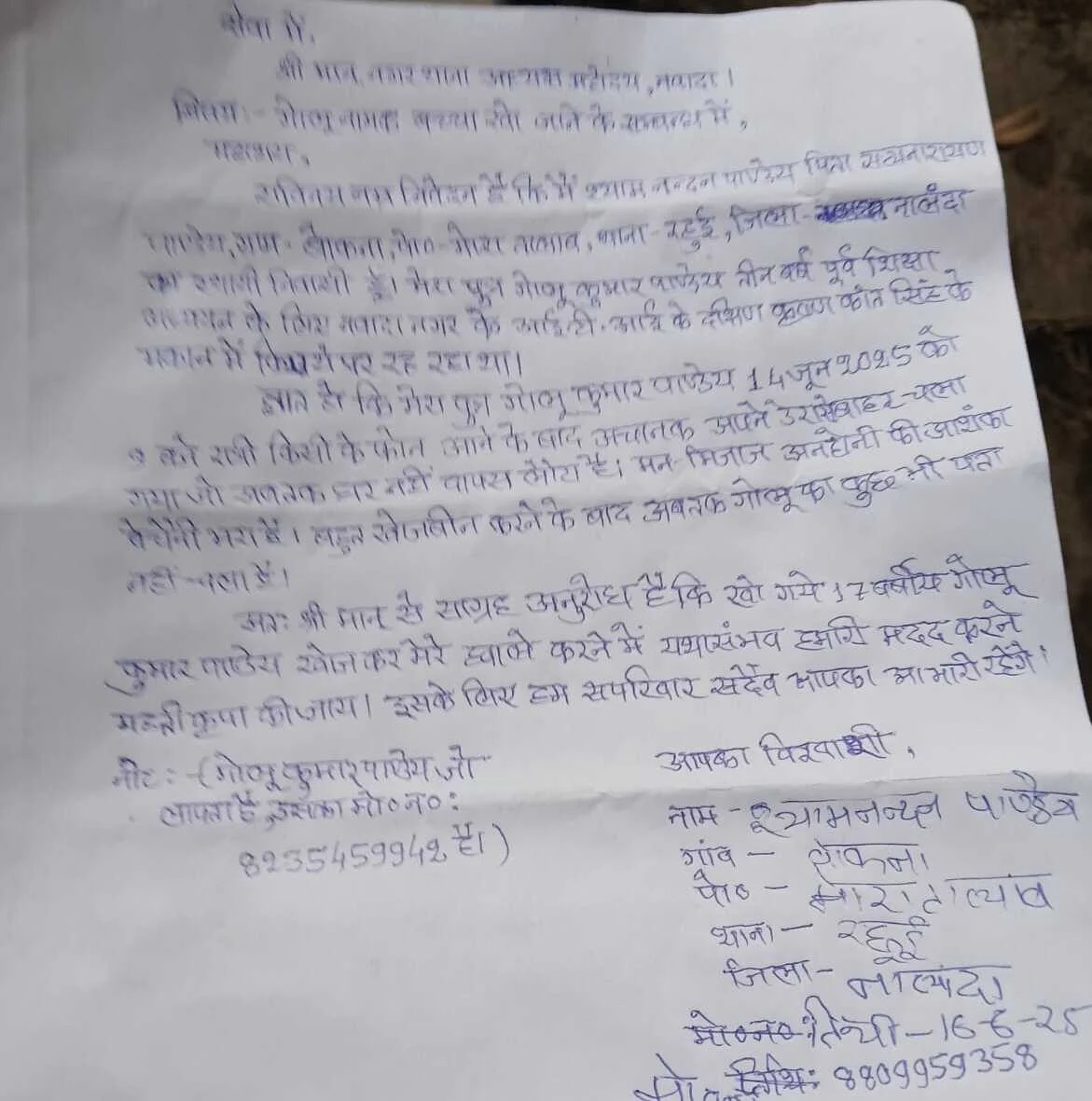 14 जून को 9 बजे रात्री किसी का फोन आया कि गोलू जल्द चले आओ। छात्र गोलू घर से चला गया तब से लौटकर घर वापस नहीं आया था ।जबसे छात्र गोलू लापता हुआ,तबसे उसका मोबाइल का स्विच ऑफ बता रहा था। गोलू के मोबाइल का न.8235459942 था ।अपने तमाम नाता – कुटुंब, दोस्त व हितैषी सभी जगह खोज कर थक जाने के बाद लापता छात्र गोलू के पिता श्याम नंदन पाण्डेय ने नगर थानाध्यक्ष को आवेदन दिया था।