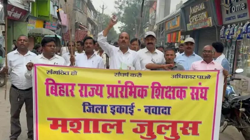 नवादा : बिहार राज्य प्रारंभिक शिक्षक संघ ने राज्य संघ के आह्वान पर विभिन्न मांगों को लेकर मशाल जुलूस निकाला। जिला अध्यक्ष रामजी प्रसाद की अध्यक्षता में आयोजित जुलूस भगत सिंह चौक से शुरू हुआ। थाना रोड होते हुए समाहरणालय के निकट धरना स्थल तक पहुंचा। शिक्षक संघ ने सात प्रमुख मांगें रखीं। विशिष्ट शिक्षकों के वेतन निर्धारण की तत्काल मांग की गई। साथ ही उन्हें सेवा निरंतरता का लाभ देने की मांग की गई। नियोजित शिक्षकों के लिए कालबद्ध प्रोन्नति की मांग की गई।
