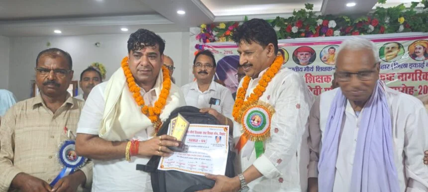 नवादा : अखिल भारतीय मौर्य शिक्षक सह शिक्षा मंच बिहार जिला इकाई नवादा के तत्वावधान में रविवार को रामबृक्ष प्रसाद शिक्षक सम्मान, उत्कृष्ट नागरिक सम्मान एवं मुंद्रा देवी प्रतिभा सम्मान समारोह-2025 का भव्य आयोजन शहर के तीन नंबर बस स्टैंड स्थित मौर्या गार्डन में किया गया। समारोह में मुख्य अतिथि के रूप में औरंगाबाद सांसद अभय कुशवाहा शामिल हुए। कार्यक्रम की अध्यक्षता संरक्षक रामकिशुन महतो ने की। मंच संचालन करते हुए शिक्षक नागेंद्र प्रसाद के साथ डा. विनीता कुमारी ने अपने मधुर वचन से लोगों का मन मोह लिया।