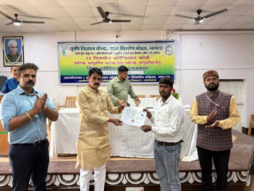 नवादा : जिले के कौआकोल प्रखंड क्षेत्र के जेपी आश्रम सोखोदेवरा में कृषि विज्ञान केंद्र,ग्राम निर्माण मण्डल के बैनर तले चल रहे उर्वरक अनुज्ञप्तिधारकों के समेकित पोषक तत्व प्रबंधन विषय पर पन्द्रह दिवसीय प्रशिक्षण का समापन हुआ। मौके पर ग्राम निर्माण मण्डल के प्रधानमंत्री अरविन्द कुमार ने प्रशिक्षण के समापन उपरांत सभी प्रतिभागियों के बीच प्रमाण पत्र का वितरण कर उनके उज्ज्वल भविष्य की कामना की।