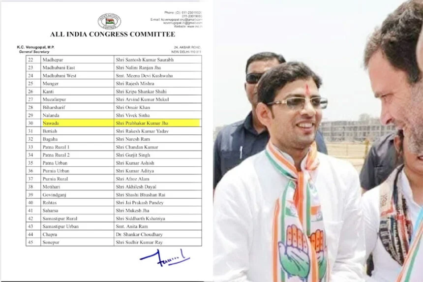 नवादा : जिला कांग्रेस अध्यक्ष पद पर नयी नियुक्ति की गयी है। अखिल भारतीय कांग्रेस कमेटी अध्यक्ष खड़गे ने इससे संबंधित पत्र जारी किया गया है। जारी पत्र के अनुसार युवा एवं संगठन में कई पदों पर कार्य कर चुके प्रभाकर झा को जिले की कमान सौंपी गयी है। वे सतीश कुमार उर्फ मंटन सिंह का स्थान ग्रहण करेंगे। नियुक्ति पत्र नवमनोनित अध्यक्ष को उपलब्ध करा दी गयी है।