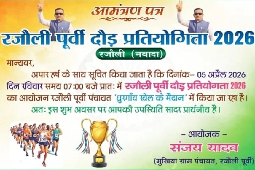 नवादा : जिले के रजौली प्रखंड क्षेत्र के रजौली पूर्वी पंचायत धुरगांव खेल मैदान में 05 अप्रैल को दौड़ प्रतियोगिता आयोजित किया जाएगा। प्रातः साढ़े सात बजे आयोजित दौड़ प्रतियोगिता के सफल प्रतिभागियों को पुरस्कृत किया जाएगा।