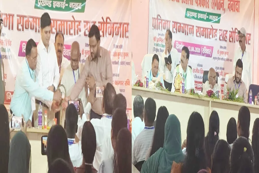 नवादा : जिला पत्रकार संगठन की नरहट इकाई द्वारा रविवार को नरहट प्रखंड सभागार में भव्य पत्रकार सम्मेलन और प्रतिभा सम्मान समारोह का आयोजन किया गया। कार्यक्रम में पत्रकारों की एकजुटता और बच्चों को प्रोत्साहित करने पर जोर दिया गया। कार्यक्रम की शुरुआत विशिष्ट अतिथि रजौली एसडीपीओ गुलशन कुमार व नरहट बीईओ निशांत प्रियदर्शी के साथ ही वरीय पत्रकार रविन्द्र नाथ भैया, पत्रकार संगठन के मुख्य संरक्षक डॉ.आर.पी.साहू व जिलाध्यक्ष अरविंद कुमार रवि, जिला सचिव रविन्द्र पांडेय व अन्य अतिथियों द्वारा दीप प्रज्जवलित कर की गई।