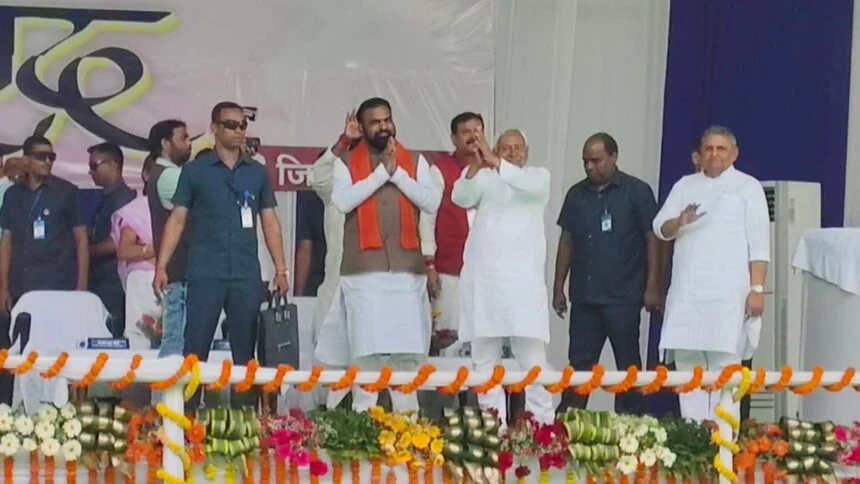 नवादा : बिहार के मुख्यमंत्री Nitish Kumar आज नवादा पहुंच चुके हैं। उनके आगमन को लेकर पहले से ही प्रशासन द्वारा व्यापक तैयारी की गई थी। जिला प्रशासन और पुलिस बल सुरक्षा व्यवस्था को लेकर पूरी तरह सतर्क नजर आ रहे हैं। मुख्यमंत्री के कार्यक्रम स्थल पर बड़ी संख्या में लोगों की भीड़ जुटनी शुरू हो गई है। स्थानीय जनप्रतिनिधि, पार्टी कार्यकर्ता और आम नागरिक मुख्यमंत्री के संबोधन को सुनने के लिए उत्साहित दिख रहे हैं।