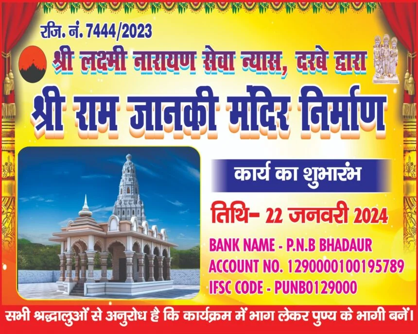 वहीं न्यास के कोषाध्यक्ष ललन कुमार ने बताया कि मंदिर के शेष कार्यों को पूर्ण करने हेतु श्रद्धालुओं एवं धर्मपरायण लोगों से सहयोग का आग्रह किया गया है। सहयोग के लिए श्रीलक्ष्मीनारायण सेवा न्यास द्वारा पंजाब नेशनल बैंक, भदौर का खाता विवरण जारी किया गया है—